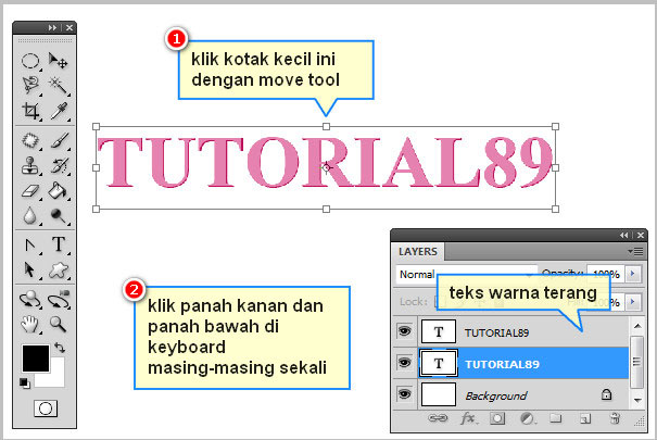 4. Geser tulisan yang berwarna gelap ke kanan dan kebawah dengan cara Klik panah bawah dan kanan pada keyboard masing-masing sekali. Pastikan layer teks warna terang berada di atas leyer teks warna gelap.
